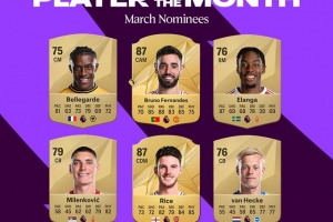 体育资讯3月27日讯 英超联赛今天公布了3月份最佳球员候选名单,B费、赖斯领衔。